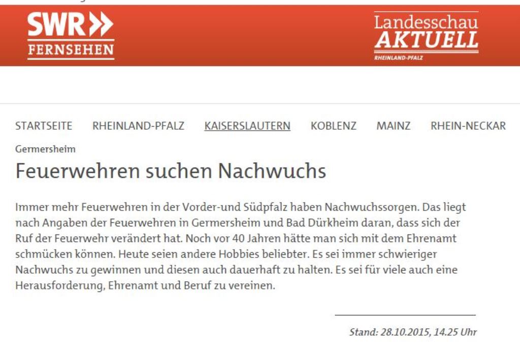 SWR berichtet über Zukunft und Nachwuchs der Feuerwehren