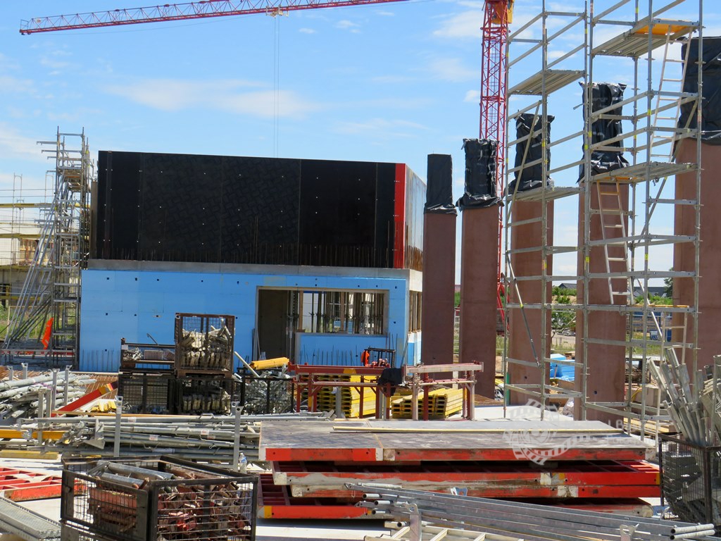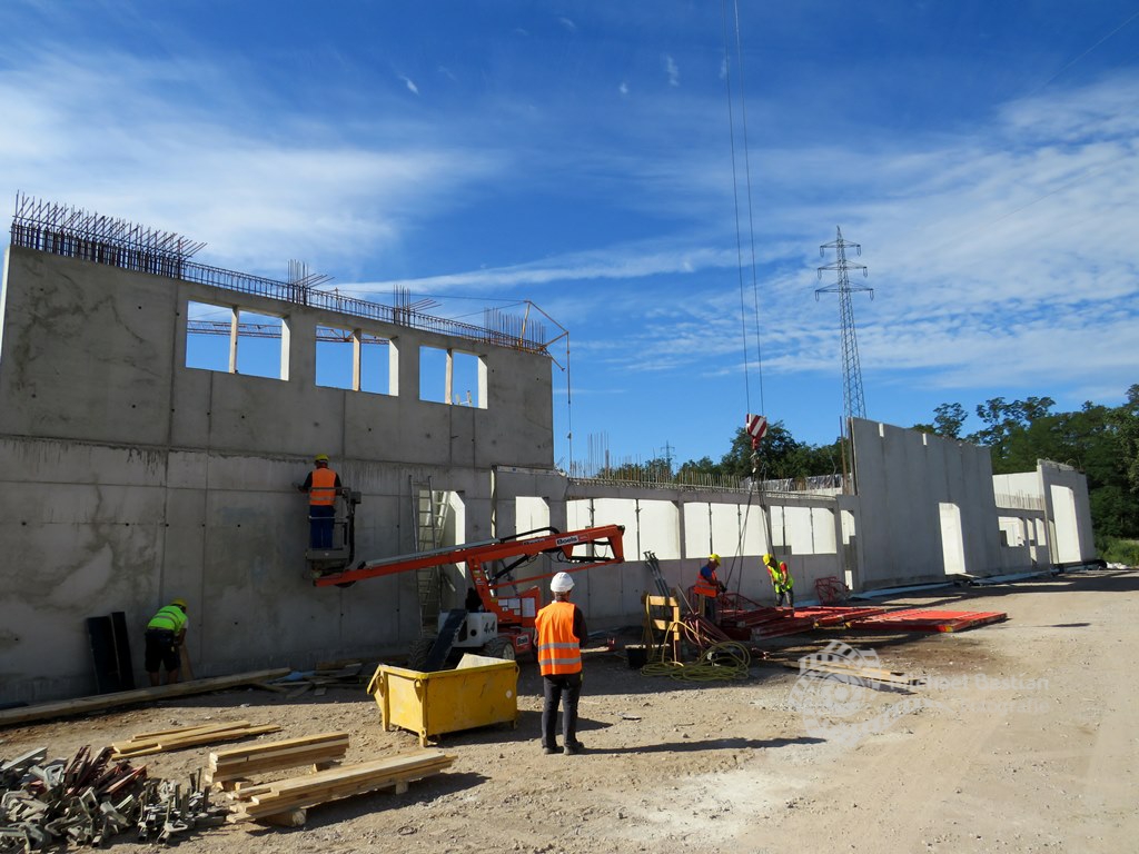 Nach und nach werden weitere Außenwände errichtet und gleichzeitig werden weitere Innenwände hochgezogen. Beim Kopfbau am südlichen Ende ist der Rohbau des Erdgeschosses weit fortgeschritten und der Bau des 1. Obergeschosses hat begonnen. Aber auch auf der nördlichen Seite, dort wo sich später der Eingangsbereich und die FEZ befinden werden, kann man große Fortschritte erkennen. Überhaupt ist die Kontur der künftigen Feuerwache Tag für Tag besser zu erkennen.