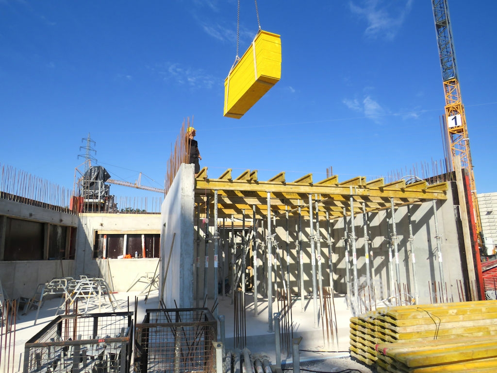 Im Bereich der zukünftigen Waschhalle, der Werkstätten, des Lagers und der Annahmestelle DLZ Süd wurden die ersten Wände gestellt. Sie werden fertig angeliefert und mit einem Autokran in Position gebracht. Die Wände bestehen aus fertigen Elementen und werden vor Ort noch bewehrt, verschalt und mit Beton vergossen. Dies ermöglicht einen zügigen Baufortschritt.