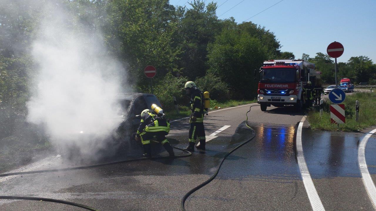 Aus noch unbekannter Ursache hatte am Sonntagnachmittag ein Pkw zwischen den Anschlussstellen GER-Süd und GER-Mitte Feuer gefangen. Der Fahrer des Wagens bemerkte einen dumpfen Schlag von der Front seines Fahrzeugs und stellte plötzlich eine Rauchentwicklung im Motorraum fest. Geistesgegenwärtig konnte er rechtzeitig die vierspurige Bundesstraße verlassen, bevor sein Fahrzeug im Abfahrtsbereich der Anschlussstelle GER-Mitte stehen blieb. Die Freiwillige Feuerwehr Germersheim löschte nach dem Eintreffen an der E-Stelle das brennende Auto ab und nahm mit Ölbindemittel die geringfügig ausgetretenen Betriebsstoffe auf. Zur Höhe des vom Feuer angerichteten Sachschadens können noch keine Angaben gemacht werden, es kann jedoch von einem wirtschaftlichen Totalschaden ausgegangen werden. Für den Zu- und Abfahrtsbereich war kurzzeitig eine Voll- und später eine Teilsperrung erforderlich.