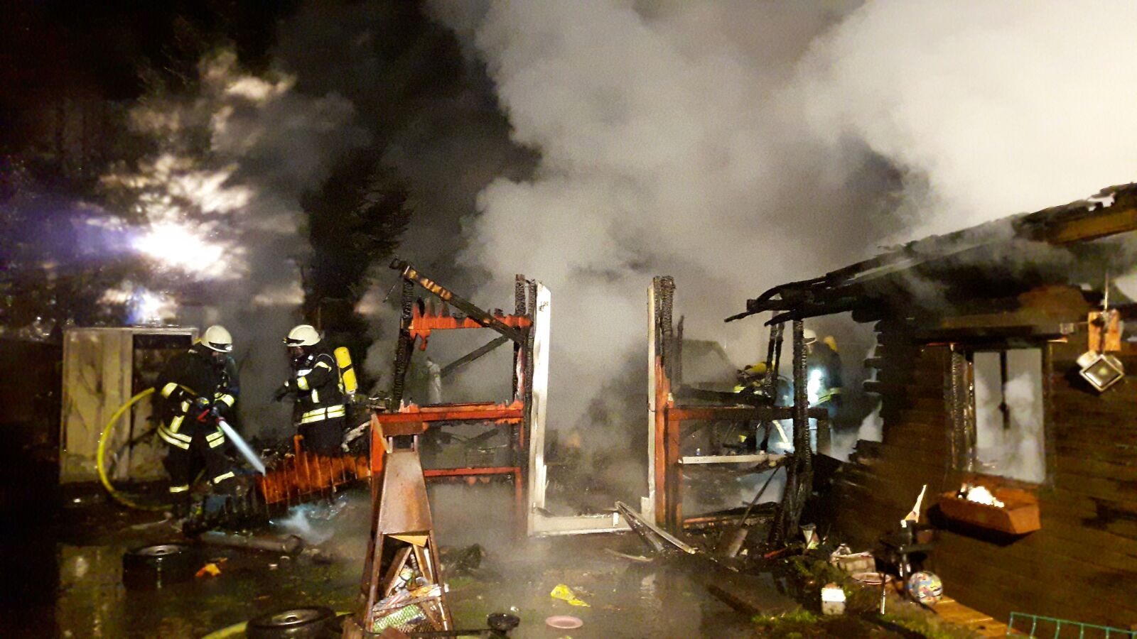 In der Nacht von Freitag auf Samstag meldeten mehrere Anrufe der Leitstelle einen Brand im Bereich des Naherholungsgebiets Sondernheim. Beim Eintreffen der ersten Einsatzkräfte brannte eine Parzelle am Campingplatz in voller Ausdehnung. Das Feuer griff bereits auf die Nachbarparzellen über. Da aufgrund eines technischen Defekts das Tanklöschfahrzeug zunächst nicht zur Verfügung stand wurden die Feuerwehren Lingenfeld und Westheim zur Unterstützung der Einsatzkräfte nachgefordert. Auch ein Vertreter der Campingplatzbetreiber, sowie der Ortsvorsteher der Gemeinde Sondernheim kamen zur Einsatzstelle um sich ein Bild von der Lage zu machen. Zunächst wurde von den ersten Einsatzkräften eine Riegelstellung zu den Nachbarparzellen aufgebaut. Des Weiteren wurde eine Wasserversorgung zu den beiden Löschfahrzeugen aufgebaut. Im Anschluss wurde das Feuer mit 6 C-Strahlrohren unter Atemschutz abgelöscht. Nach den Löscharbeiten wurde der Brandschutt auseinander gezogen und Glutnester abgelöscht. Ein Feuerwehrmann verletzte sich bei den Löscharbeiten leicht und musste vorsorglich vom Rettungsdienst zur Untersuchung ins Krankenhaus Germersheim gebracht werden. Im Verlauf des Einsatzes wurden 8 Trupps unter Atemschutz eingesetzt.
