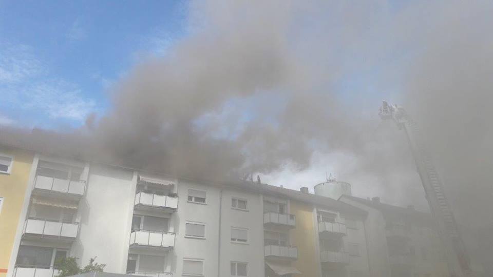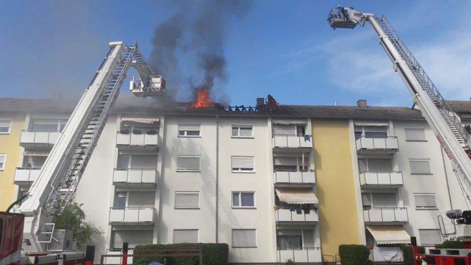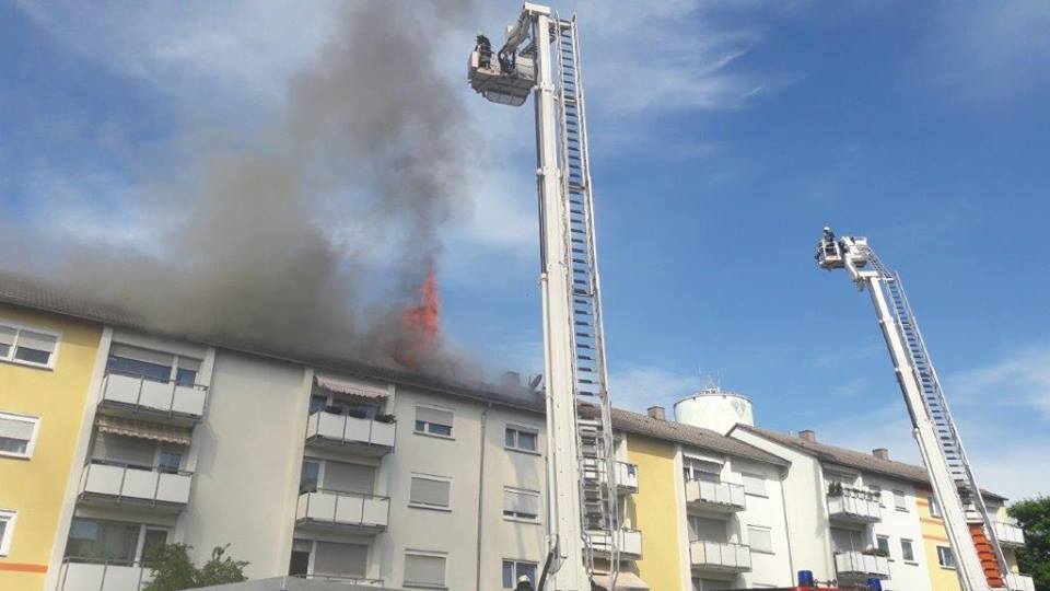Wegen eines Technischen Defekts kam es im Bereich des Dachgeschosses eines Mehrfamilienhauses zu einem Dachstuhlbrand. Da das Dachgeschoss lediglich als Abstellraum und Wäschetrockenraum für die darunter liegenden Wohnungen diente, konnte sich der Brand bis zur Entdeckung bereits ausbreiten. Nach Eintreffen der ersten Einsatzkräfte wurde direkt ein Trupp unter Atemschutz ins Dachgeschoss zur Lageerkundung und Brandbekämpfung geschickt. Parallel wurde der Teleskopgelenkmast in Stellung gebracht um eine Brandbekämpfung von oben durchführen zu können. Da es sich bei dem Objekt um eine Reihenbebauung handelte und nicht ausgeschlossen werden konnte dass der Brand auf das Nachbargebäude übergriff wurde zusätzlich ein weiterer Teleskopgelenkmast der Werkfeuerwehr Daimler Germersheim AG nachgefordert. Das Fahrzeug wurde auf der anderen Seite der Brandstelle in Stellung gebracht. Parallel wurden die Feuerwehren Lingenfeld und Westheim alarmiert um weitere Atemschutzgeräteträger vor Ort zu haben. Aufgrund der Brandintensität hatte das Feuer auf den Nachbar Dachstuhl übergriffen. Mit der Brandbekämpfung waren gleichzeitig 4 Trupps unter Atemschutz in den beiden Gebäuden eingesetzt. Zwischenzeitlich wurde ebenfalls eine Brandbekämpfung über die beiden Teleskopgelenkmastfahrzeuge durchgeführt. Nachdem der Brand unter Kontrolle war konnten die ersten Kräfte aus dem Einsatz herausgelöst werden. Die Nachlöscharbeiten zogen sich noch bis in die späten Abendstunden. Da die beiden Gebäude unbewohnbar sind kamen viele der Bewohner bei Freunden und Bekannten unter. Um die Bewohner die keine Möglichkeiten hatten eine Übernachtungsmöglichkeit zu haben kümmerten sich Mitarbeiter der Stadtverwaltung Germersheim. Auch der Bürgermeister war vor Ort um sich ein Bild von der Lage zu machen. Zur Versorgung der Einsatzkräfte und der Bewohner wurde die SEG-Betreuung des Landkreises Germersheim alarmiert. Die Ermittlungen der Kriminalpolizei sind inzwischen abgeschlossen.