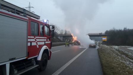 Aus bislang ungeklärter Ursache begann ein Fahrzeug auf der B9, in Fahrtrichtung Karlsruhe, zu brennen. Der Fahrzeugführer steuerte sein Fahrzeug auf den Seitenstreifen und verständigte die Feuerwehr. Bei Eintreffen an der Einsatzstelle befand sich das Fahrzeug in Vollbrand. Das Feuer konnte durch einen Trupp unter Atemschutz schnell abgelöscht werden. Die B9 war während der Löschmaßnahmen in Fahrtrichtung Karlsruhe voll gesperrt. Bis zum abschleppen des Fahrzeugs konnte bereits eine Fahrspur wieder freigegeben werden.