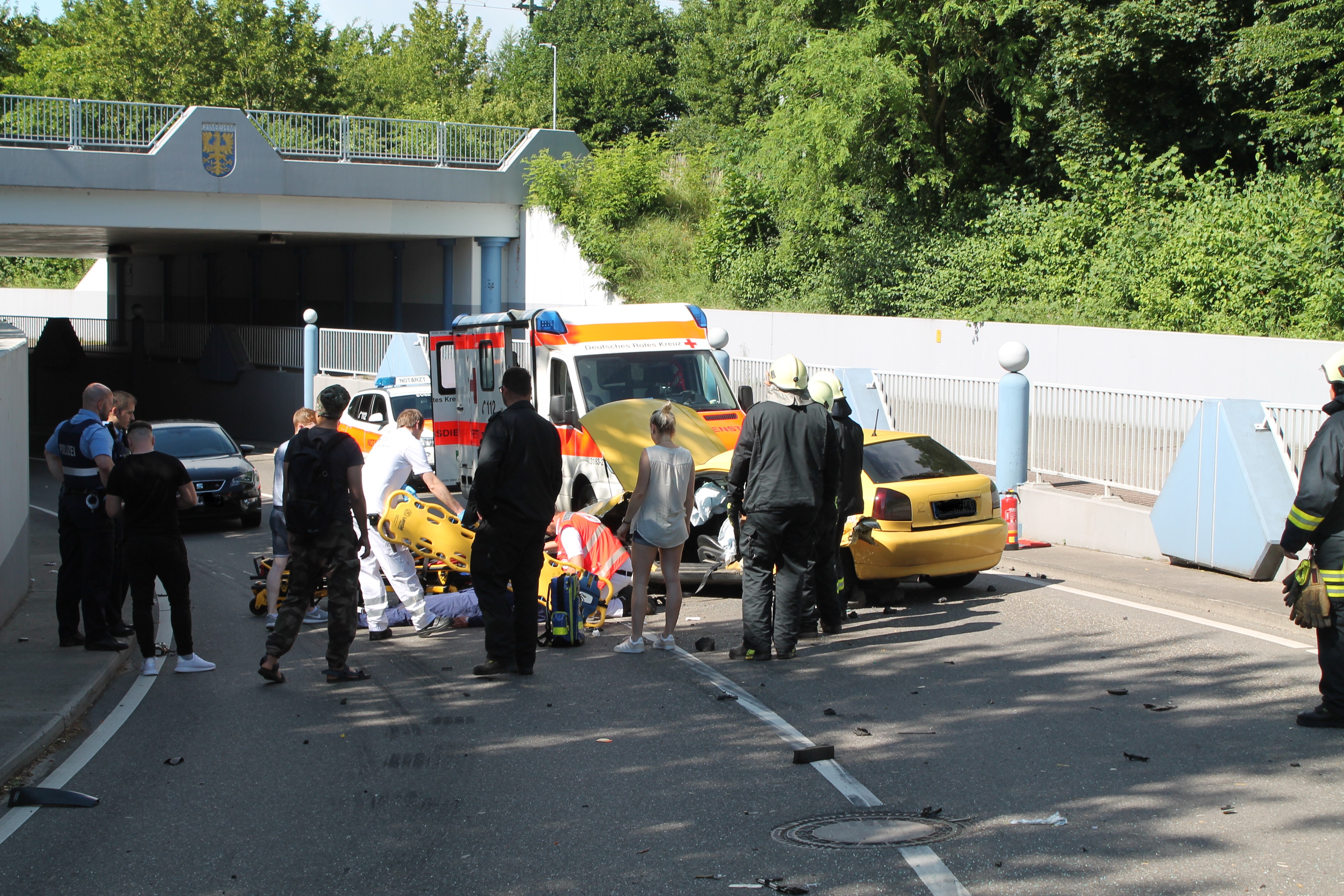Die Feuerwehr Germersheim wurde durch die Leitstelle Landau zu einem Verkehrsunfall, mit eingeklemmter Person, in die Rheinbrückenstraße alarmiert. Da um diese Uhrzeit an der Einsatzstelle erfahrungsgemäß mit einem erhöhten Verkehrsaufkommen zu rechnen ist, wurde die Einsatzstelle unmittelbar mit dem HLF 20 und dem LF 16/12 von zwei unterschiedlichen Richtungen aus angefahren. Beim Eintreffen an der Einsatzstelle stellte sich heraus, dass die Polizei bereits sehr gut abgesperrt hatte und die Einsatzstelle ohne größere Probleme angefahren werden konnte. Die Person war bereits aus dem Fahrzeug befreit und wurde von einem Ersthelfer, der ebenfalls angehöriger der Feuerwehr Germersheim ist und hauptberuflich beim Rettungsdienst arbeitet, versorgt. Von Seiten der Feuerwehr wurde lediglich noch die Fahrzeugbatterie abgeklemmt, der Brandschutz sichergestellt und der im Anschluss an die Unfallaufnahme eingetroffene Abschleppdienst unterstützt.
