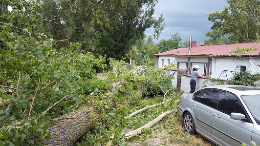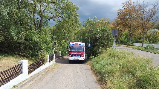 Anwohner meldeten einen abgebrochen Ast, der in einen Garten stürzte. Bei dem Ast handelte es sich um einen Ast größeren Durchmessers, der eine Mauer und einen Anhänger beschädigt hat. Der Ast wurde im Bereich des Gartens entfernt. Im Anschluss wurde die Einsatzstelle an den Eigentümer übergeben. Der Baum muss durch eine Fachfirma entfernt werden.