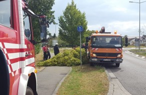 Umgestürzter Baum auf einem Radweg, Baum mittels Kettensäge zerkleinert und vom Radweg entfernt. Einsatzstelle dem städtischen Betriebshof übergeben.