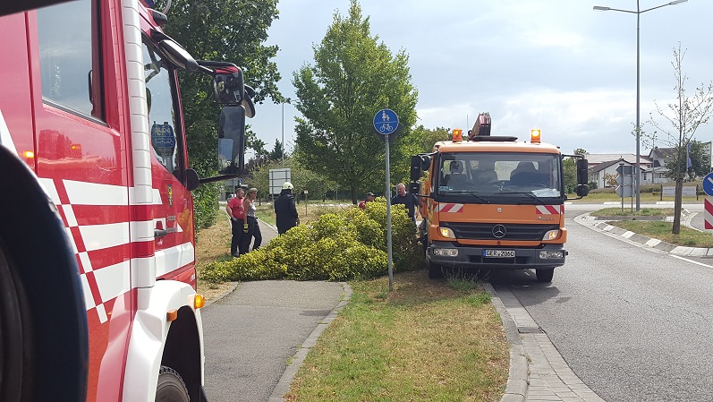 Umgestürzter Baum auf einem Radweg, Baum mittels Kettensäge zerkleinert und vom Radweg entfernt. Einsatzstelle dem städtischen Betriebshof übergeben.