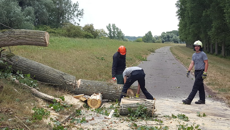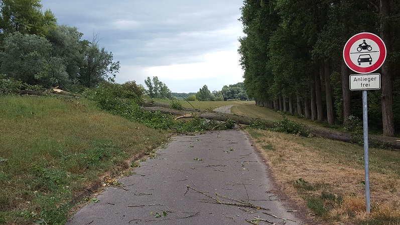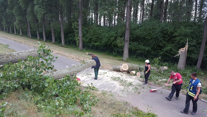 Größerer umgestürzter Baum blockierte einen Radweg. Baum mittels Motorsäge entfernt, Radweg grob gereinigt und die Einsatzstelle dem Städtischen Betriebshof übergeben.
