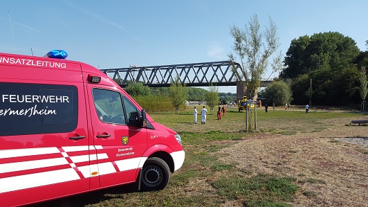 Ein Wakeboardfahrer stürzte und trieb anschließend in Höhe der Eisenbahnbrücke im Rhein. Da in diesem Moment in unmittelbarer Nähe ein Frachtschiff vorbei fuhr, alarmierten besorgte Passanten am Ufer die Rettungskräfte. Noch bevor die ersten Einsatzkräfte vor Ort waren wurde die Person von einem Jetskifahrer aufgenommen und sicher in den Hafen Germersheim gebracht. Da beim Eintreffen der ersten Einsatzkräfte die Situation zunächst unübersichtlich und unklar war, rückten eine Vielzahl von Einsatzkräften aus. Neben der Feuerwehr Germersheim wurde vorsorglich das DLRG Wörth mit alarmiert. Die Einsatzkräfte des DLRG mussten jedoch nicht mehr zum Einsatz ausrücken. Ebenfalls vor Ort waren die Polizei, ein Rettungswagen und der Rettungshubschrauber des ADAC, aus Ludwigshafen.