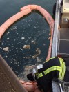 Gewässerverunreinigung durch Ölfilm im Hafen Germersheim.