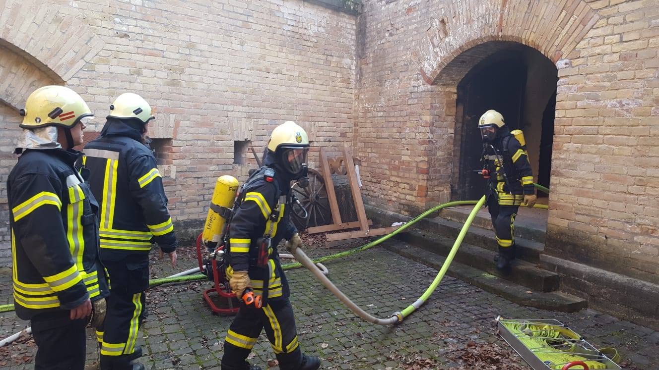Es stellte sich heraus, dass wohl aus Fahrlässigkeit eine kleinere Menge Unrat in einem Gewölbekeller des Festungsgebäudes zu brennen begann. Der recht große Brandraum wurde zügig nach weiteren Personen abgesucht und das Feuer gelöscht. Um eine ausreichende Ventilation im Gebäude zu gewährleisten, wurde eine zweite Abluftöffnung geschaffen und das Gebäude anschließend mit unserem Überdruckbelüfter rauchfrei gemacht.