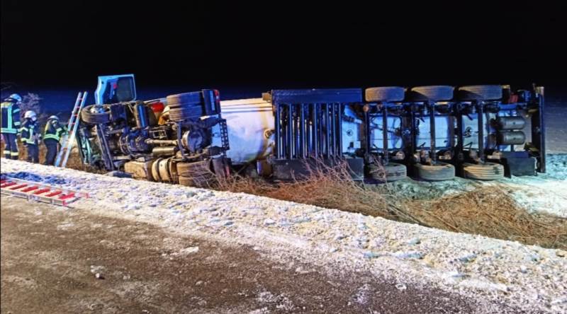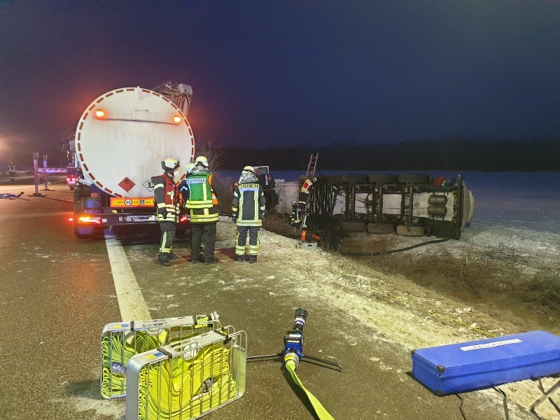 Der Fahrer des LKW’s hatte in der Nacht, vermutlich wegen schlechten Witterungsverhältnissen die Kontrolle über sein Gespann verloren. In der Folge kippte der Gefahrguttransporter dann seitlich in den Straßengraben. Der Fahrer wurde dabei glücklicherweise nicht ernsthaft verletzt, musste aber dennoch das Geschehnis erst einmal mit Hilfe des Rettungsdienstes verarbeiten.