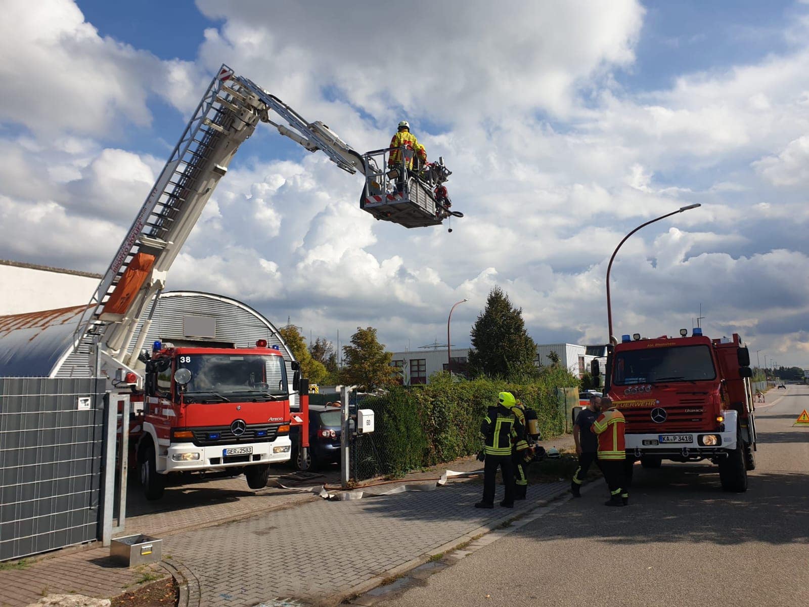 Überörtliche Hilfe mittels Hubrettungsfahrzeug bei einem Werkstattbrand im benachbarten Philippsburg. Über unseren Gelenkmast wurde die Dachhaut geöffnet und Teile der Isolation entfernt. Dadurch konnten auch letzte Glutnester mittels Wärmebildkamera lokalisiert und abgelöscht werden.