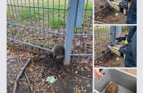 Eingeklemmter Igel in Stabmattenzaun. Zaun mittels hydraulischen Gerät geweitet, Igel befreit und an Polizei übergeben. Diese transportierten das leicht verletzte Tier in eine Tierauffangstation.