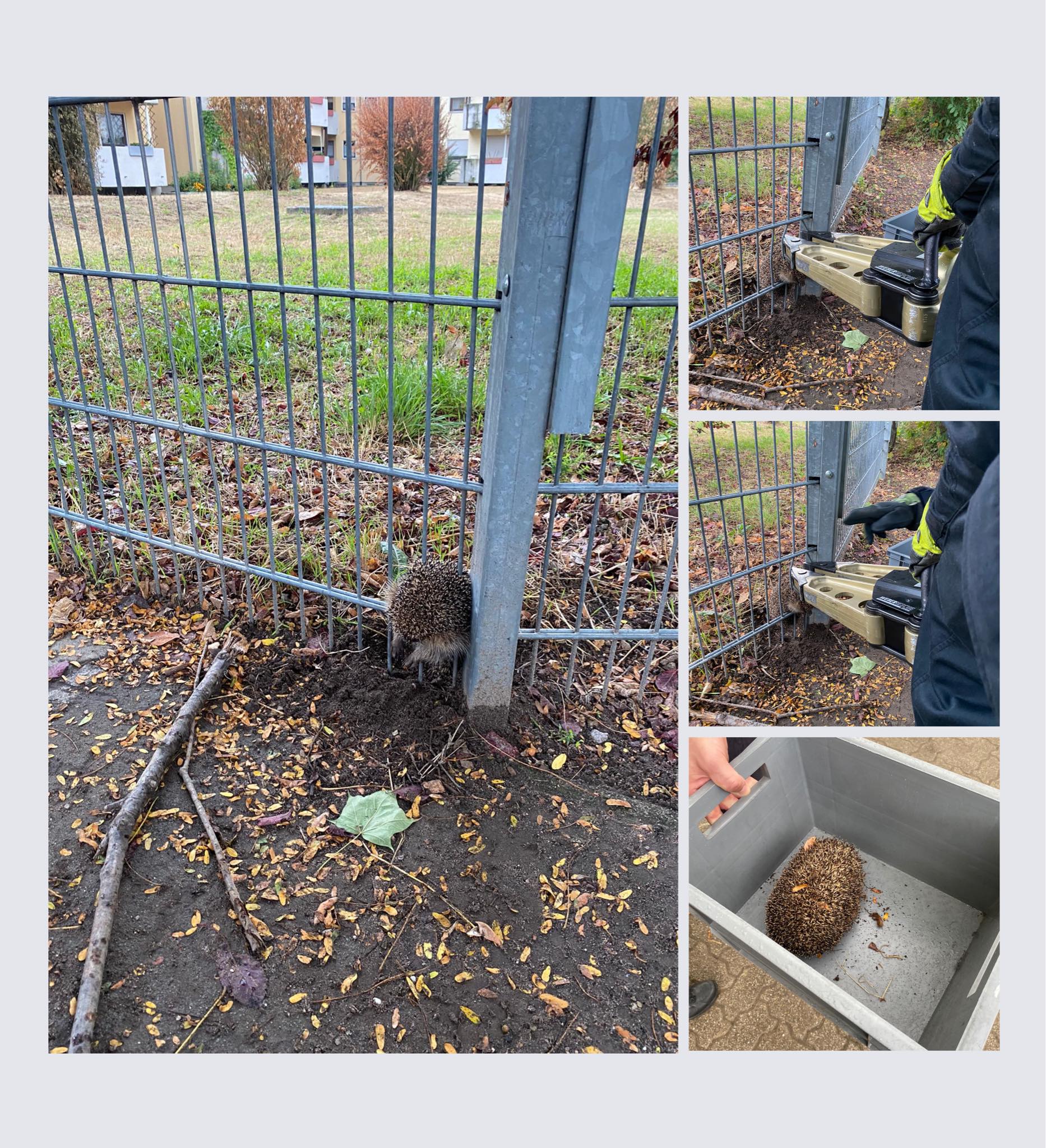 Eingeklemmter Igel in Stabmattenzaun. Zaun mittels hydraulischen Gerät geweitet, Igel befreit und an Polizei übergeben. Diese transportierten das leicht verletzte Tier in eine Tierauffangstation.