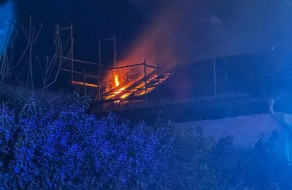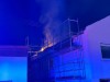 Überörtliche Hilfe mittels Hubrettungsfahrzeug beim Brand eines Dachstuhl in einem leerstehenden Gebäude in Lingenfeld.