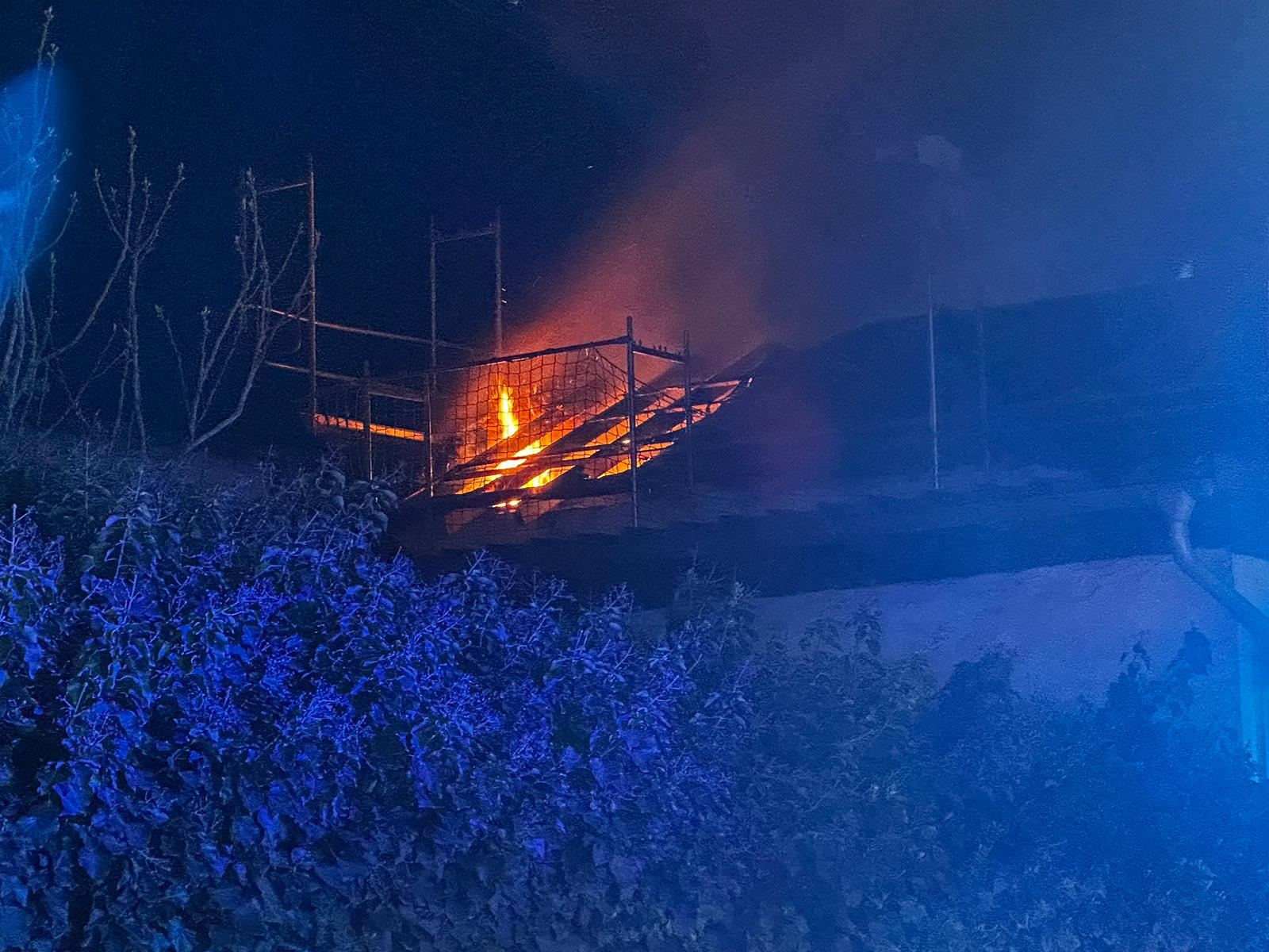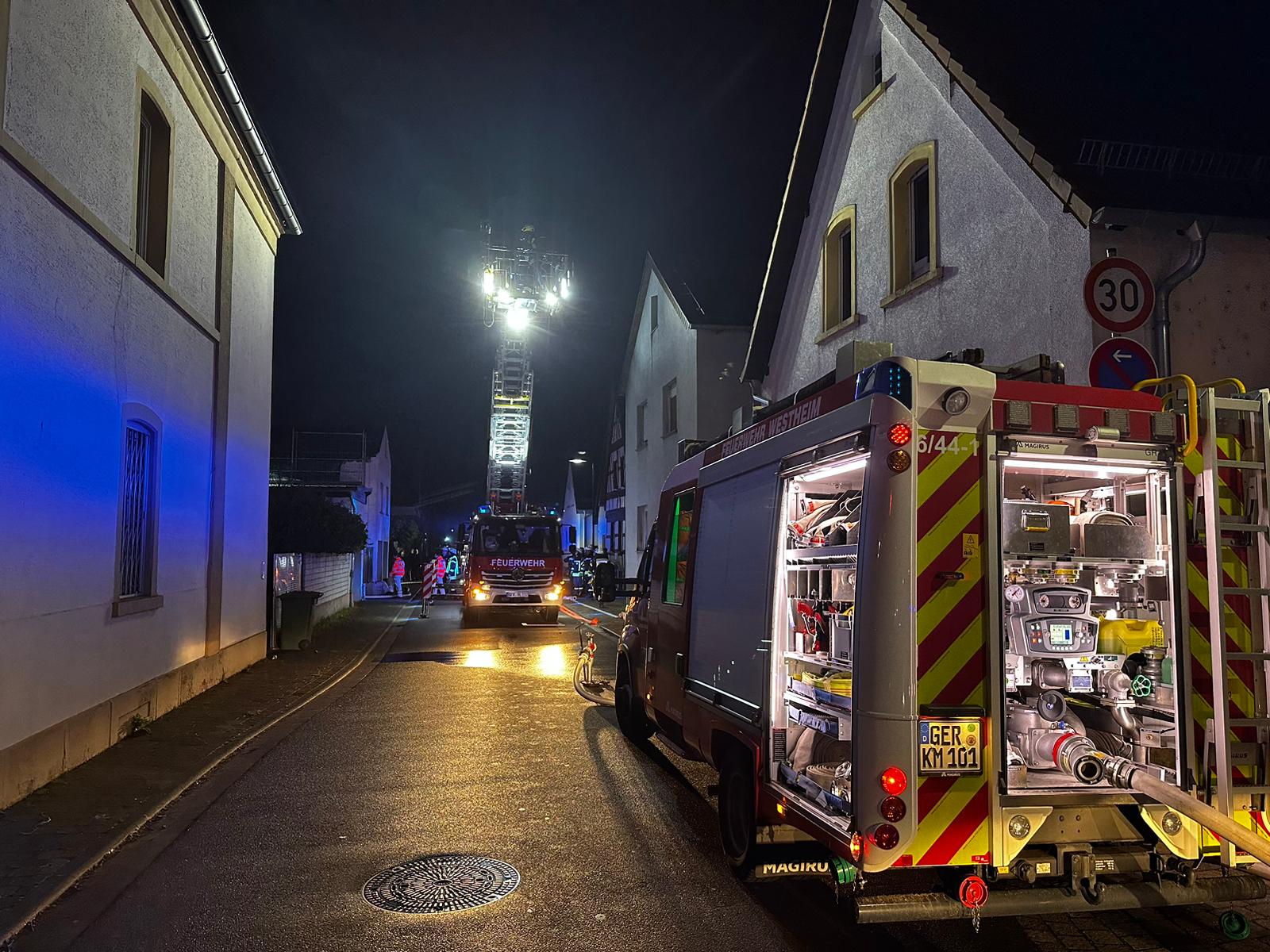 Überörtliche Hilfe mittels Hubrettungsfahrzeug beim Brand eines Dachstuhl in einem leerstehenden Gebäude in Lingenfeld.