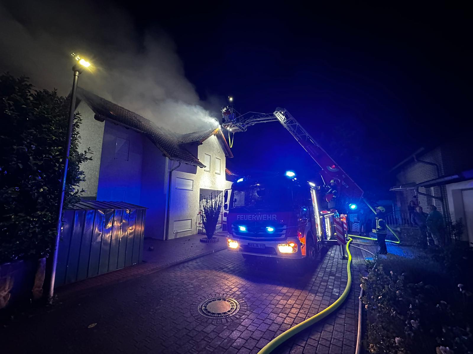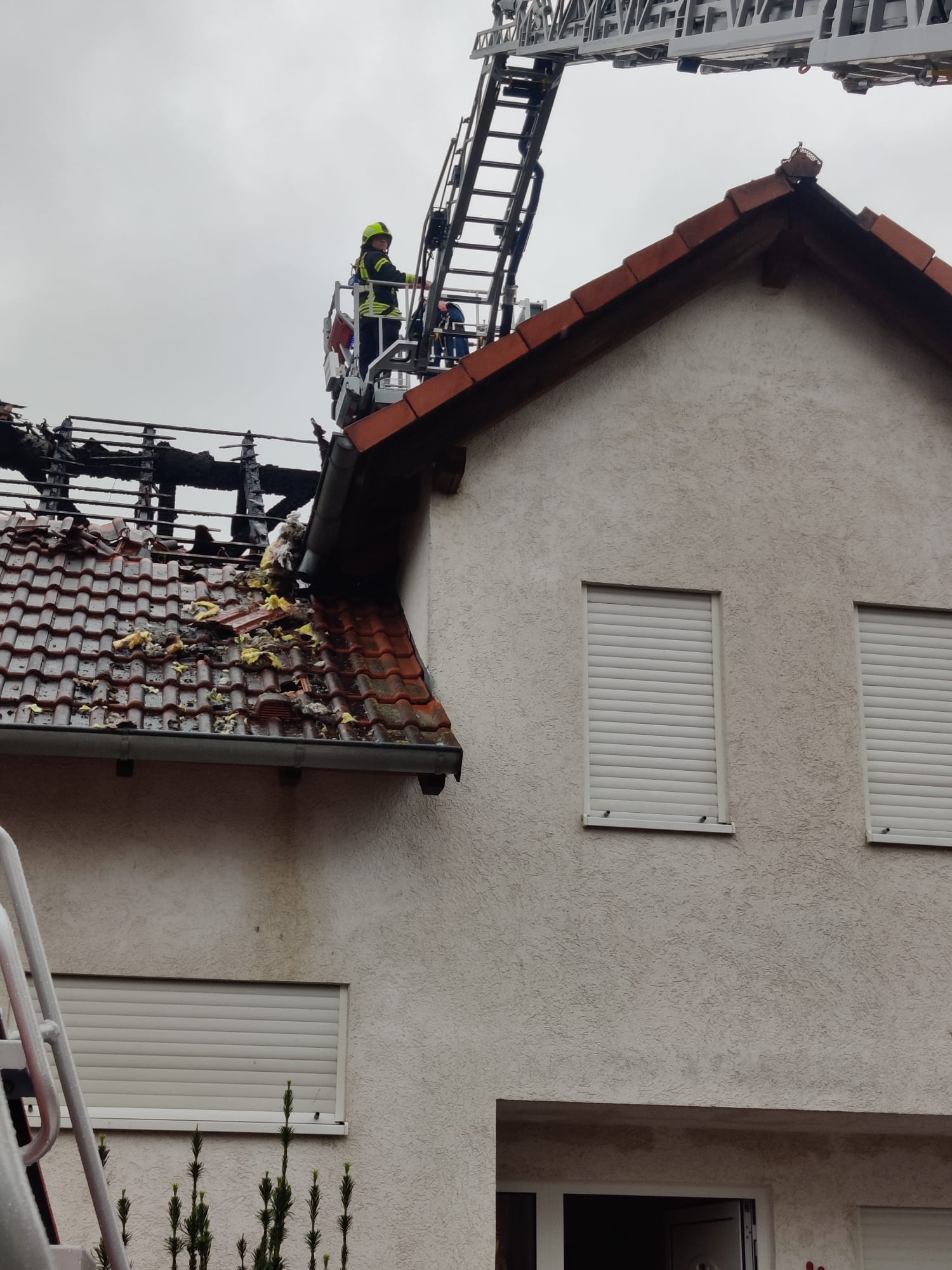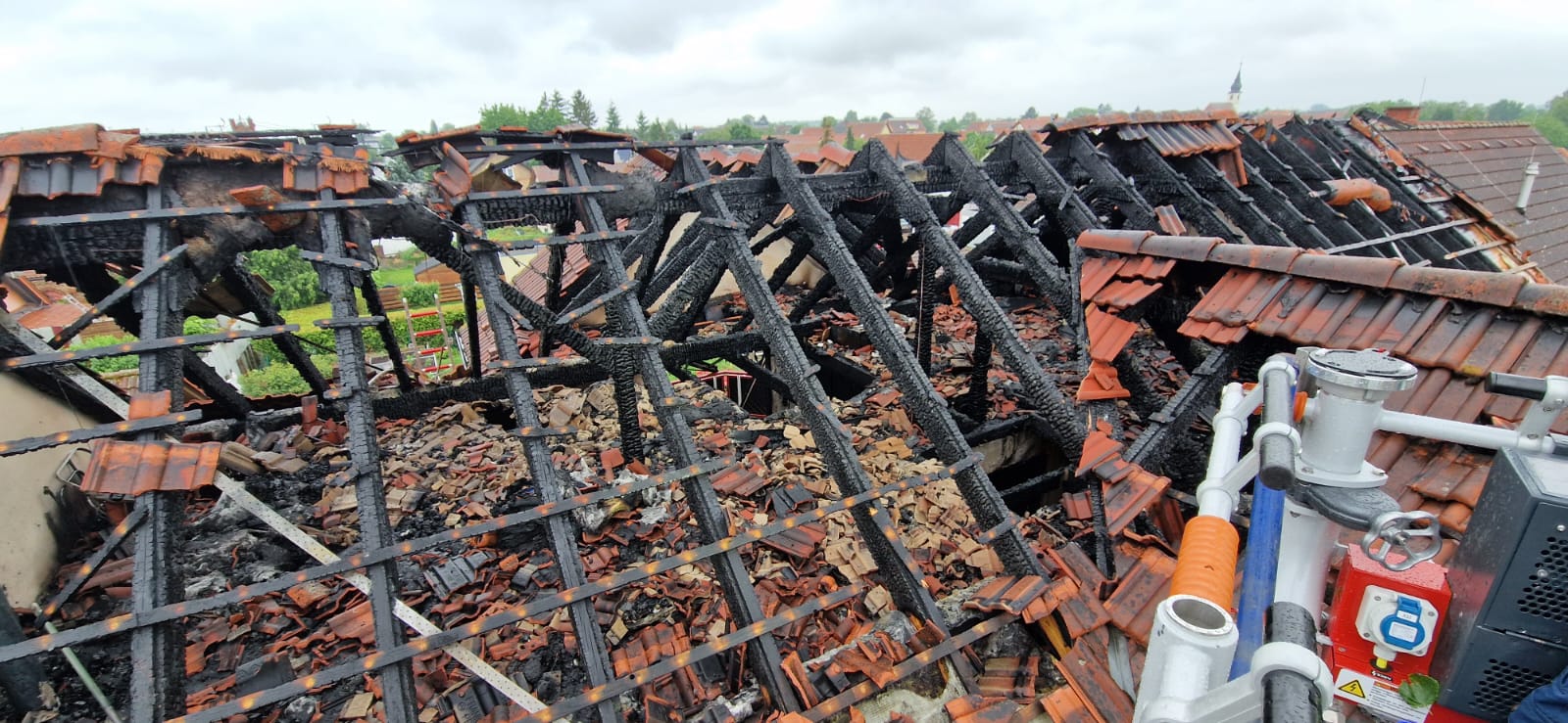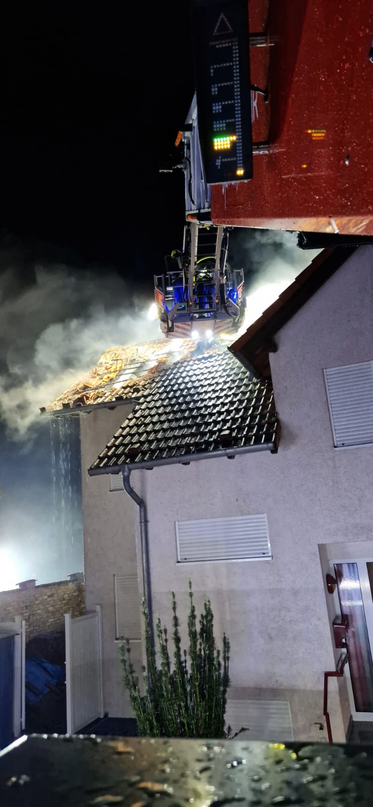 Überörtliche Hilfe mittels Hubrettungsfahrzeug und Atemschutzgeräteträgern bei einem Dachstuhlbrand in Freisbach.