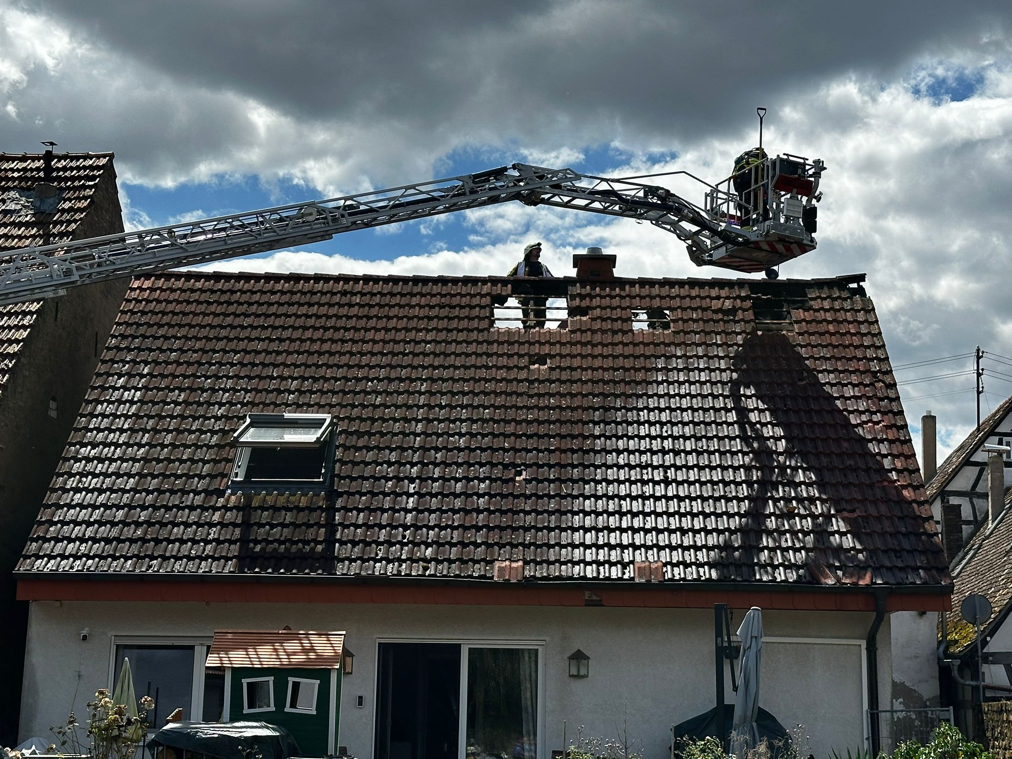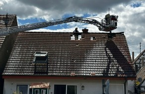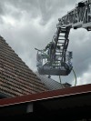 Überörtliche Hilfe mittels Hubrettungsfahrzeug bei einem Dachstuhlbrand in Freisbach.