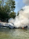 Im Germersheimer Hafen brannte ein Boot in voller Ausdehnung. Angrenzende wurden durch die starke Hitzeentwicklung in Mitleidenschaft gezogen. Das Feuer konnte bis zu unserem eintreffen von einem Jetski Fahrer in Schach gehalten werden, indem er größere „Heckwellen“ erzeugte. Die Löscharbeiten im Anschluss konnten mittels C-Rohr über einen Steg erfolgen. Im Nachgang wurden in Absprache mit der Unteren Wasserbehörde noch Ölschlängel um das Boot verlegt um eine Ausbreitung der Betriebsstoffe zu verhindern.