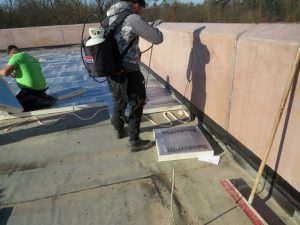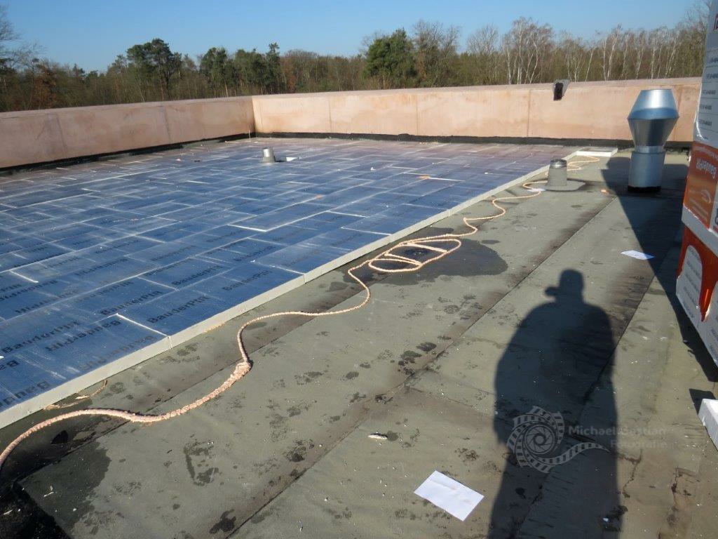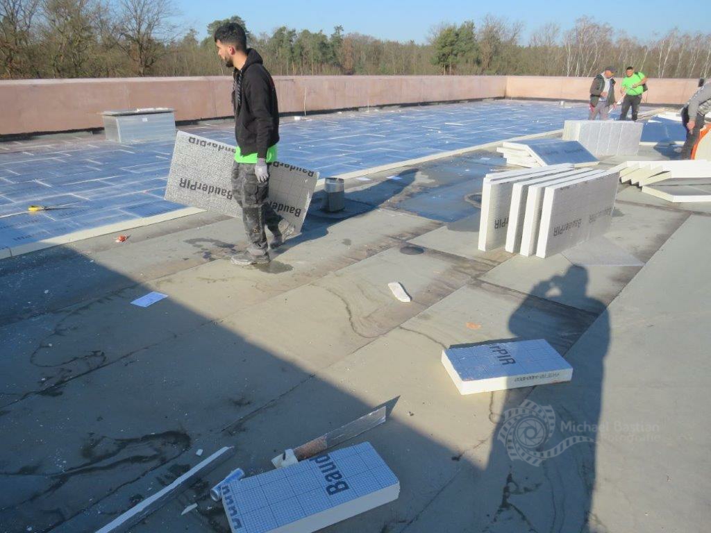 Nachdem bereits im Dezember und auch im Januar der Bitumenanstrich und die erste Lage auf die Betonfläche des Flachdachs aufgebracht wurde, wird jetzt die Wärmedämmung und die abschließende Abdichtungslage aus Elastomerbitumen von der Dachdeckerfirma aufgebracht. Die Flachdachdämmplatten mit einer beiderseitigen Deckschicht aus Aluminium sind aus Polyurethan (Hartschaum) gefertigt und 80mm stark. Sie werden mit einem Kleber auf der Bitumen-Abdichtungslage aufgeklebt.